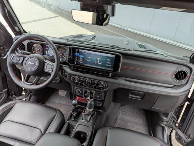 Вшановуючи традиції армійського оригіналу, салон тестового Jeep Wrangler зустрічає вас майже вертикальною панеллю приладів. Проте після чергового оновлення її прикрашає величезний дисплей мультимедійної системи Uconnect 5, про яку вояки минулого століття не могли навіть мріяти. Мультимедійка не лише наочно демонструє безліч параметрів, які дуже корисно знати справжньому джип еру (від температури та тиску мастила і заряду акумулятора до нахилу кузова та стану диференціалів), але й тішить наявністю бездротових Apple CarPlay та Android Auto. Останнє важливо не так на бездоріжжі, як у повсякденному житті. Наприклад, вам треба скористатися навігацією. Можна, звичайно, побачити свій шлях на екрані смартфона, але тоді доведеться тримати його в руці, оскільки місця для нього на консолі не передбачено. На ній, власне, взагалі немає місця для якихось дрібниць, як і на дверцятах: під тонесеньку сіточку можна покласти хіба що декілька аркушів паперу, приміром детальні карти місцевості.